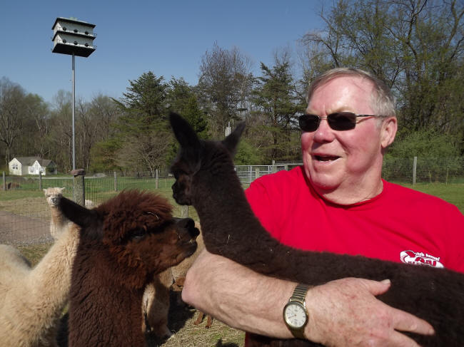 On hot summer days, the alpacas enjoy one of Scott's outdoor showers.